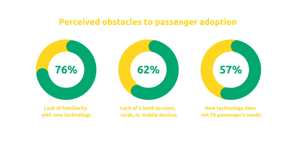 Transit agencies participating in the study also reported potential barriers their riders might face if the agency transitioned to open-loop payments. Passengers without bank accounts or who are reliant on cash may be less able to adapt to open-loop payments. Agencies also thought passengers might initially find it hard to adapt to new technology.